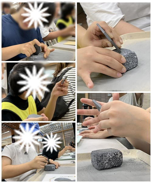 「体験」グループは、古代体験として、石包丁づくりもしくは勾玉づくりをおこないましたよ。