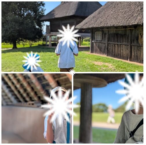 「見る」グループは、広大な敷地にある、復元された弥生時代の建物や住居を見て回りました。