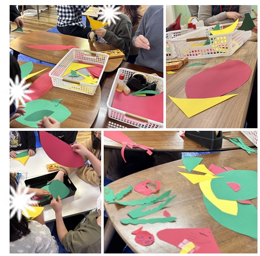 用意された画用紙は、あえて「赤・黄・緑」の3色限定!さまざまな色や形にカットされたパーツを自由に組み合わせていきます。