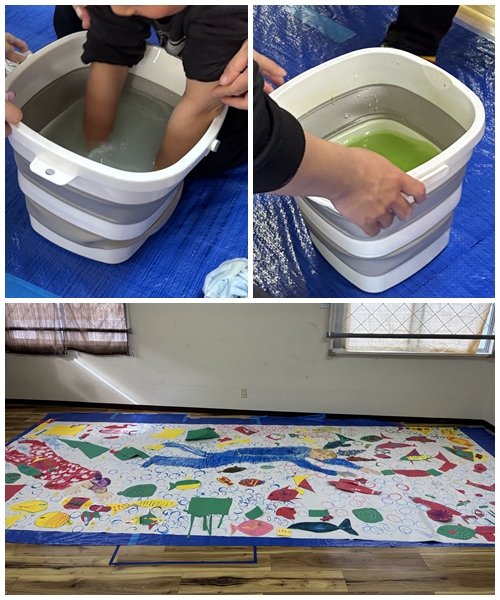 絵の具がついた手をバケツにいれると、少しずつ絵の具が溶け出し、バケツの水の色が魔法のように変わっていくのです✨✨